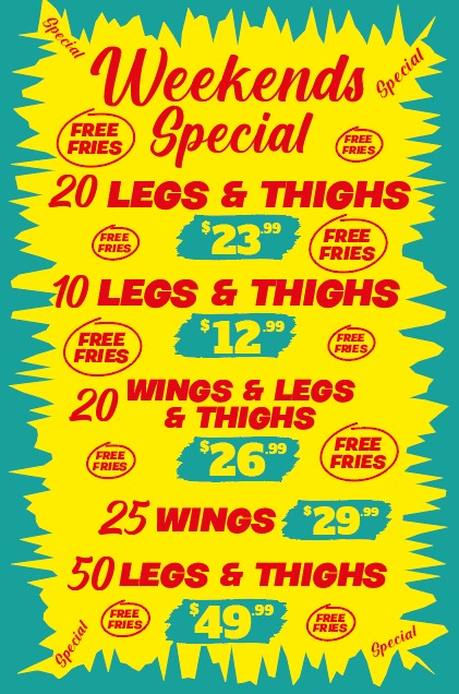 Boneless chicken wings with honey bbq or hot sauce options.served with fries &bread & coleslaw